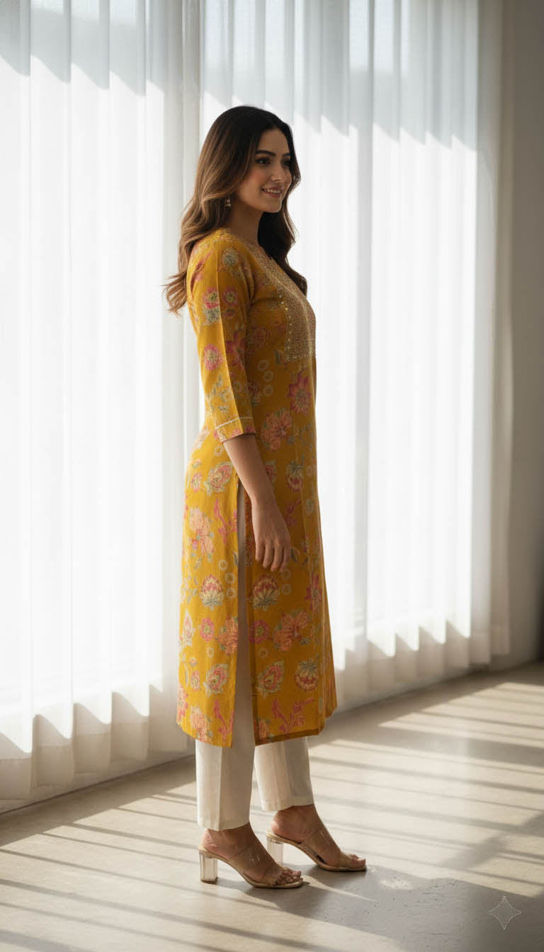 Yellow Vatican kurta, adorned with elegant embroidery that adds a touch of timeless sophistication. Crafted from premium Vatican, the fabric is lightweight, breathable, and finished with a soft natural sheen, making it ideal for all-day comfort.